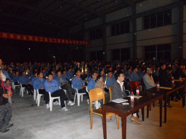 2010年10月14日晚,在公司厂房里搭建的临时舞台上,全国总工会文工团、浙江职工文工团的演职人员在欢乐、和谐的歌舞声中结束了在我公司的慰问演出,演员们的精彩表演受到了员工们的热烈欢迎。 晚会开始由公司董事长王荣庆先生致辞,感谢全总文工团演职人员的访问演出,感谢各级领导、各位来宾对太阳股份的关爱,并预祝晚会圆满成功。 一曲《在灿烂的阳光下》拉开了今晚演出的帷幕,高亢的歌声、炫目的舞蹈赢得了满堂喝彩。晚会上还演绎了许多经典老歌,《咱们的工人有力量》、《北京的金山上》等,引起观众的广泛共鸣。著名相声表演艺术家,同时也是全总文工团团长的崔金泉先生与陈会增先生共同表演了《即兴相声》节目,邀请职工参与表演,调动了全场的热烈气氛。此外还有让人叹为观止的魔术表演《阿满教你变魔术》,魔术师的精湛技法令人叹服,诙谐的表演引爆笑声……为感谢演职人员的倾情演出,员工们也纷纷上台为演员们鲜花,还有位员工在演员的盛情邀请下与之共舞,场下掌声阵阵……这一个夜晚,虽然厂房外小雨绵绵,但厂房内却是热情洋溢的欢乐的海洋。 在最后,作为企业,非常感谢全总文工团把演出送到基层,送到厂区,送到广大劳动者的心里。这些温暖将鼓励职工在今后的工作中为企业发展做出更大贡献。