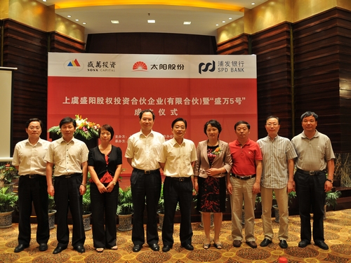 在这秋高气爽、丹桂飘香的金秋季节,我们喜迎各方宾朋,齐聚上虞国大,共祝上虞盛阳股权投资合伙企业的正式成立! 这个盛大的成立仪式由上虞市人民政府金融办公室主办,由上海盛万投资管理有限公司、浙江太阳股份有限公司及上海浦东发展银行股份有限公司绍兴上虞支行共同承办。出席仪式的有来自市组织部、发改委、财政局、科技局、工商局、工业强镇等的分管领导、有来自相关合作企业及上虞市备选上市企业的负责人、还有来自社会各界的投资人士。 会议开始,主持人介绍了与会的各位贵宾,市金融办主任朱鑫海先生的一席致辞拉开了大会帷幕。大会上,上虞市副市长吴志育先生、上海股权投资协会秘书长陈建平先生、上海浦东银行杭州分行投行部总经理刘红女士、上海盛万投资有限公司董事长严爱娥女士、浙江太阳股份有限公司董事长王荣庆先生分别做了精彩的致辞。 陈建平先生在致辞中感谢上虞市政府对于股权投资的积极支持,希望上虞市尽早成立起股权投资协会,共同促进长三角资本市场的活跃发展。陈先生说,此次来上虞寻求合作的上海盛万投资管理有限公司,其旗下的盛万基金拥有一个精研资本运作、眼光独到的优秀团队;太阳股份有限公司是一家销售有规模、产品有技术含量的制造型企业。他对上虞盛阳股权投资合伙企业的成立寄予了殷切期望。严爱娥女士对盛万投资公司做了介绍,盛万投资公司旗下正在运作的项目有18个,握有的资金达16亿,对盛阳股权投资合伙企业的发展充满信心。王荣庆先生对浙江太阳股份有限公司的历史和现状做了介绍,此次成立股权投资合伙企业,正是在新时期新形势下,积极开拓公司新的增长点,走出传统产业束缚,投身资本市场,加快转型升级,确保企业稳定健康发展的必由之路。我们从盛万投资的优秀业绩中看到了他们团队优秀的专业质素,同时,我们也相信,在上虞市委、市政府相关部门和领导的大力支持和关心爱护下,通过太阳股份和上海盛万的友好合作,我们上虞盛阳股权投资基金一定会给我市的金融资本领域注入新的强大的活力,会树起一个新的标杆、新的典范!